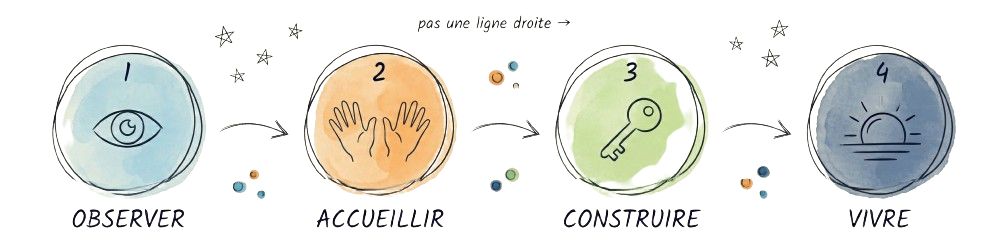 Ces concepts ne sont pas des abstractions : ils décrivent ce que l'on travaille ensemble, concrètement, en séance.
